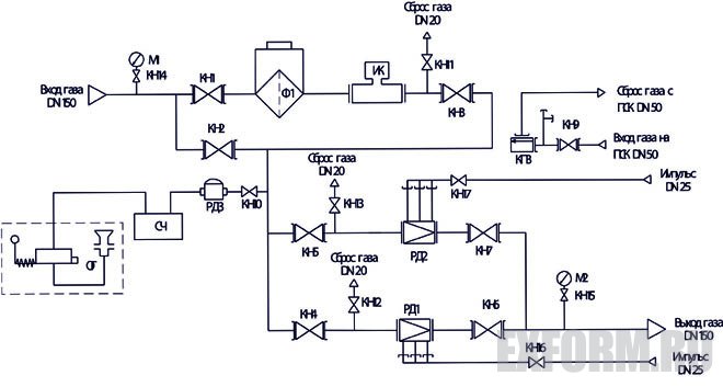 2.4. Линия редуцирования состоит из основной и резервной линии. Каждая линия редуцирования состоит из затвора поворотного КН4 (КН5) на входе, регулятора давления газа РД1(РД2), предназначенного для снижения давления газа и поддержания его в заданных пределах, а также отключения подачи газа при повышении или понижении выходного давления сверх допустимых пределов, затвора поворотного КН6 (КН7) на выходе, импульсного трубопровода с краном КН16 (КН17). Для замера давления на выходе предусмотрен манометр М2 с клапаном КН15.