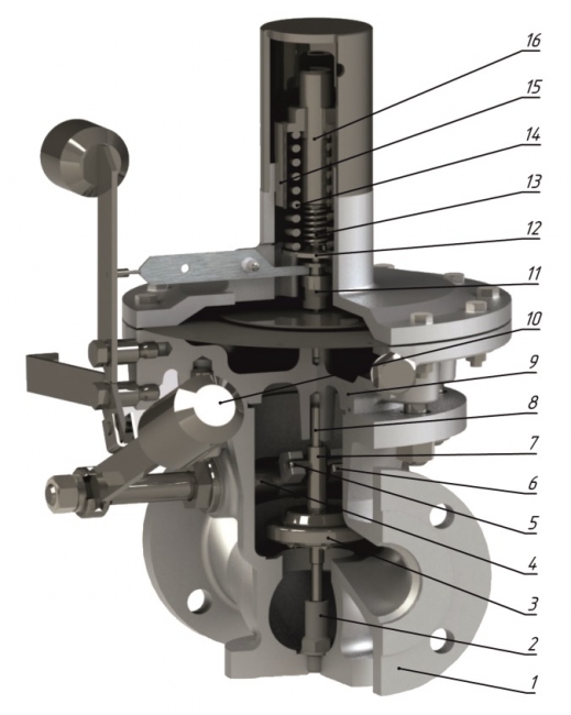 1-седло, 2-направляющая стойка, 3-клапан, 4-ось, 5-штифт, 6-вилка, 7-шток, 8-шток, 9-головка, 10-рычаг с грузом, 11-верхний торец штока, 12-шайба, 13-малая пружина, 14-пружина, 15-регулировочный стакан, 16- регулировочный винт