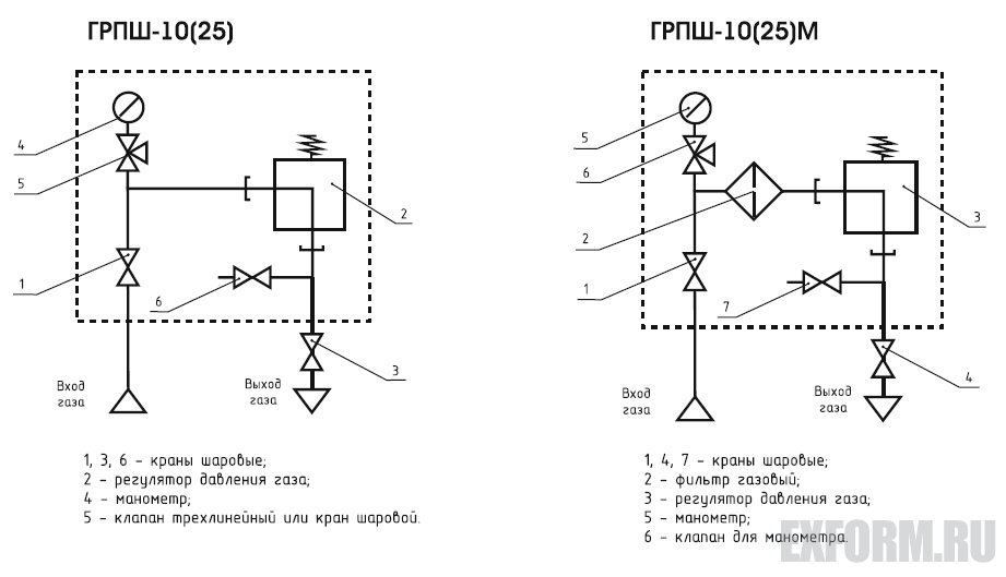 Технологическое оборудование ГРПШ-FE10 в соответствии со схемой 2 состоит из крана 1 на входе, регулятора давления газа 3, крана 4 на выходе. Для контроля давления на входе предусмотрен манометр 5 с краном 7. Для контроля давления газа на выходе предусмотрен кран 6 с ниппелем для подсоединения мановакуумметра.