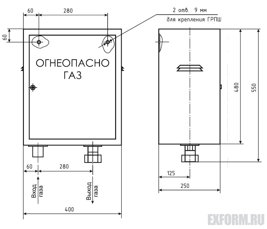 ГРПШ-FE-10 в соответствии с рисунком 1 состоят из металлического шкафа, в котором размещено технологическое оборудование. Для удобства обслуживания в шкафу имеется дверка.