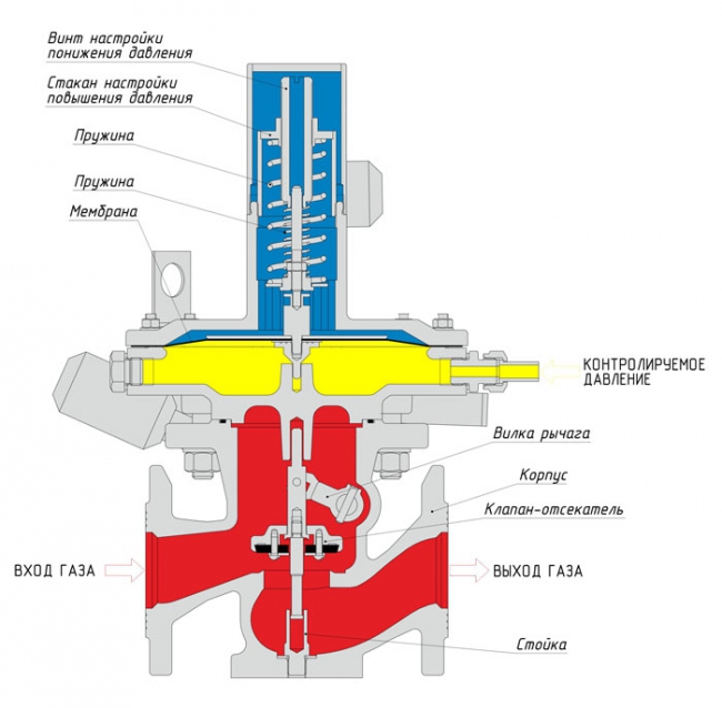 Когда контролируемое давление находится в установленных пределах, пружина нижним своим торцом через шайбу упирается в выступы стакана, крышки головки и не оказывает давления на мембрану: мембрана под давлением силы давления снизу занимает среднее положение. Гайка регулировочного винта прижата к тарелке пружины.